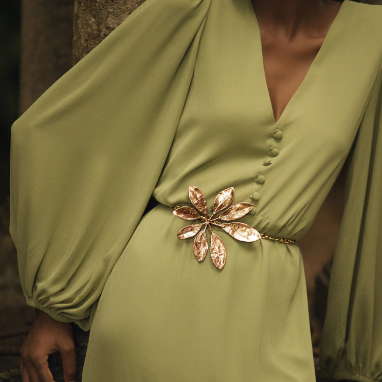 Each leaf is hand-selected and immortalized in precious metals, creating a piece that marries sustainability with beauty. Worn around the waist, it becomes more than an accessory - it becomes an embrace of nature, art, and meaning. A timeless accent, and a bold expression of organic luxury.