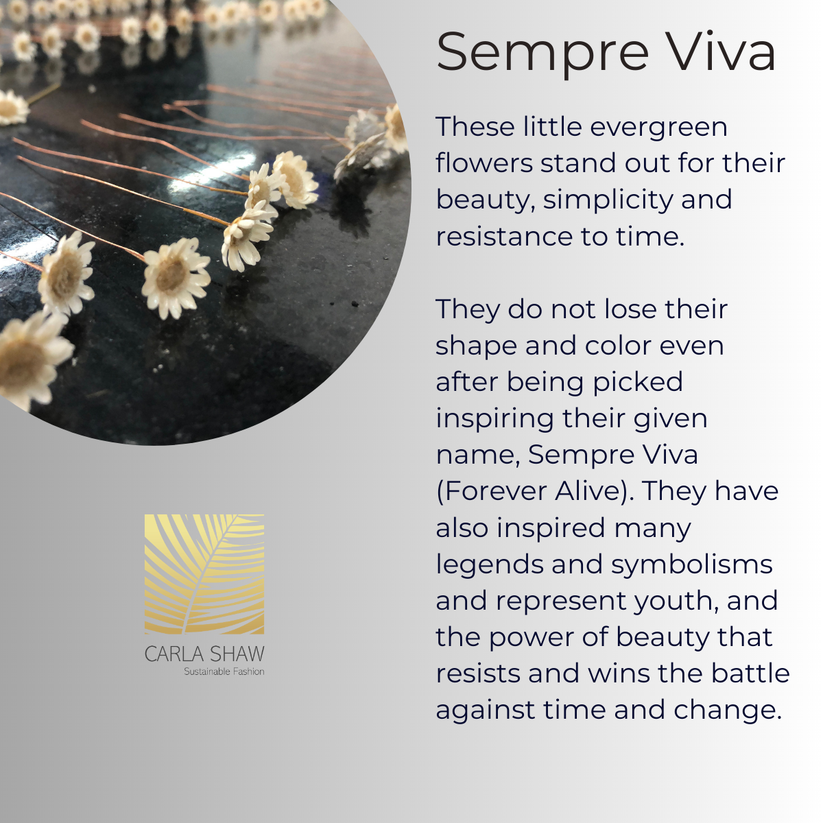 These little evergreen flowers stand out for their beauty, simplicity and resistance to time. They do not lose their shape and color even after being picked, inspiring their given name, Sempre Viva (Forever Alive).